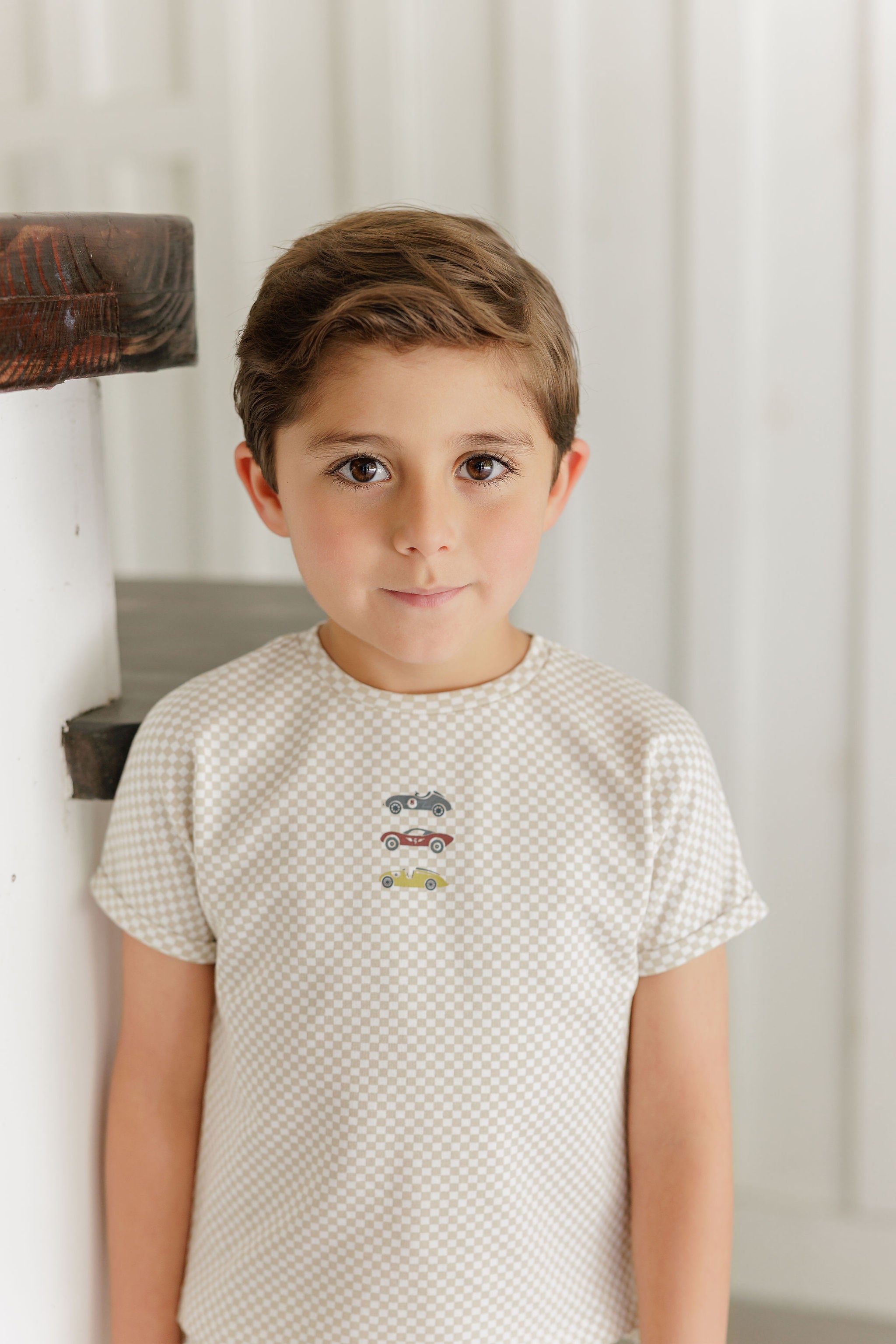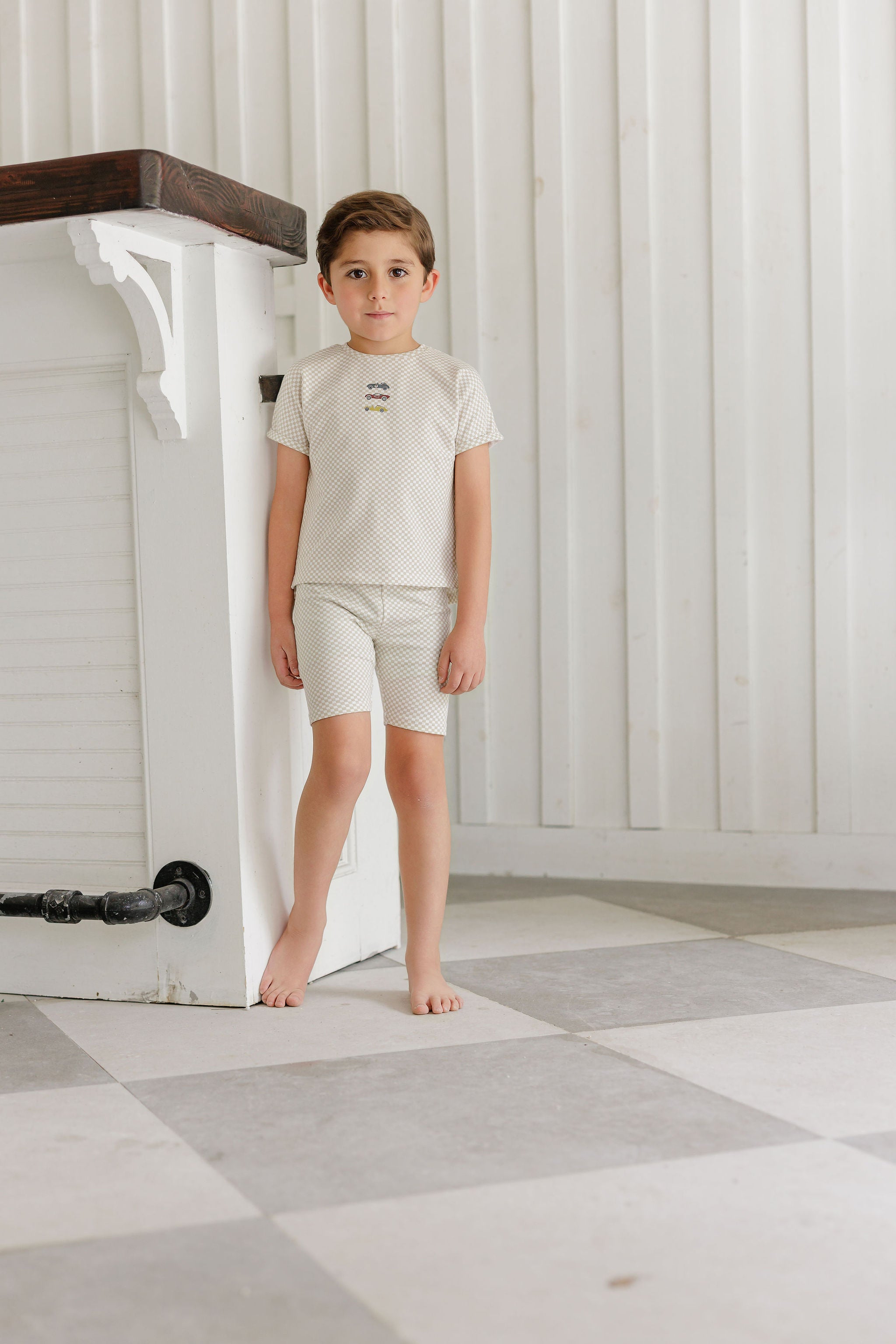 Boys Tee and Shorts – Tan – Checked Race Car