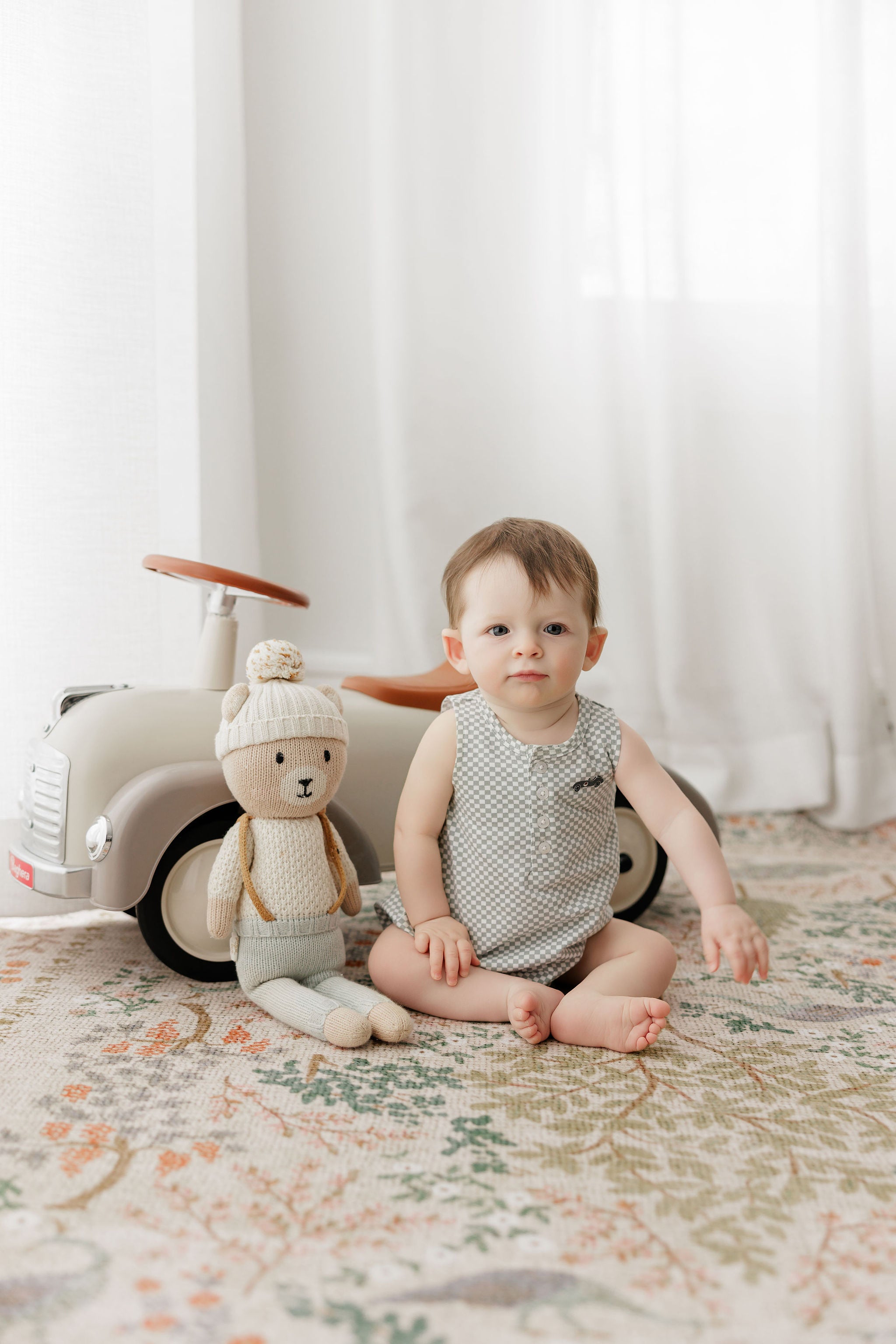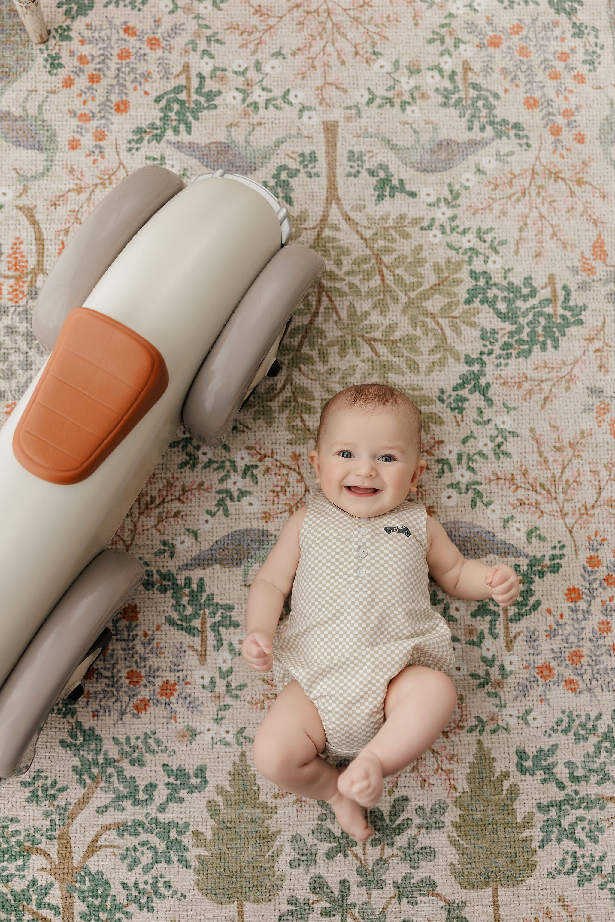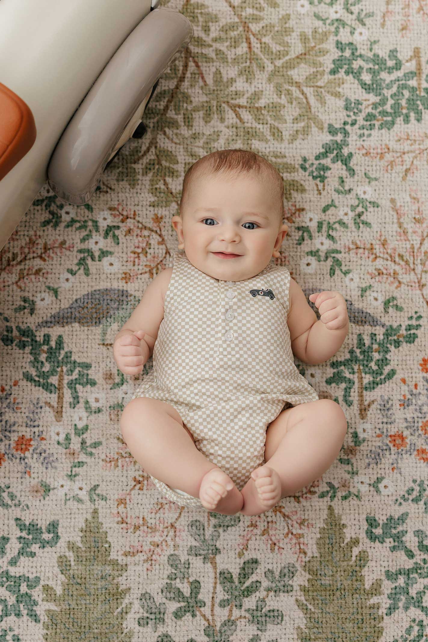 Boys Romper – Tan – Checked Race Car