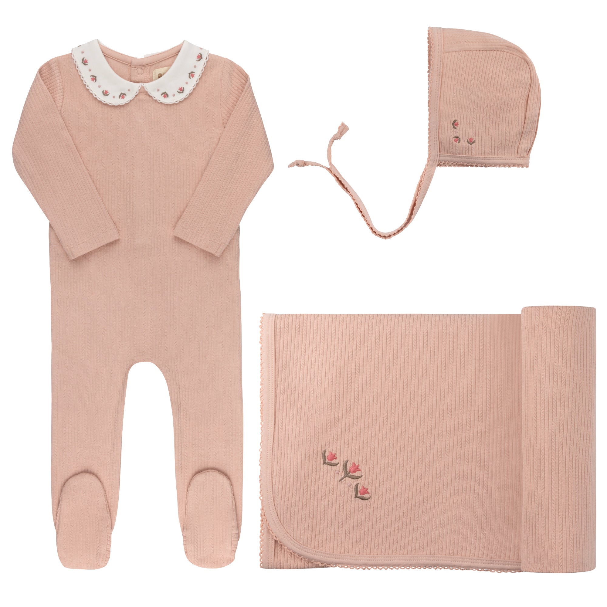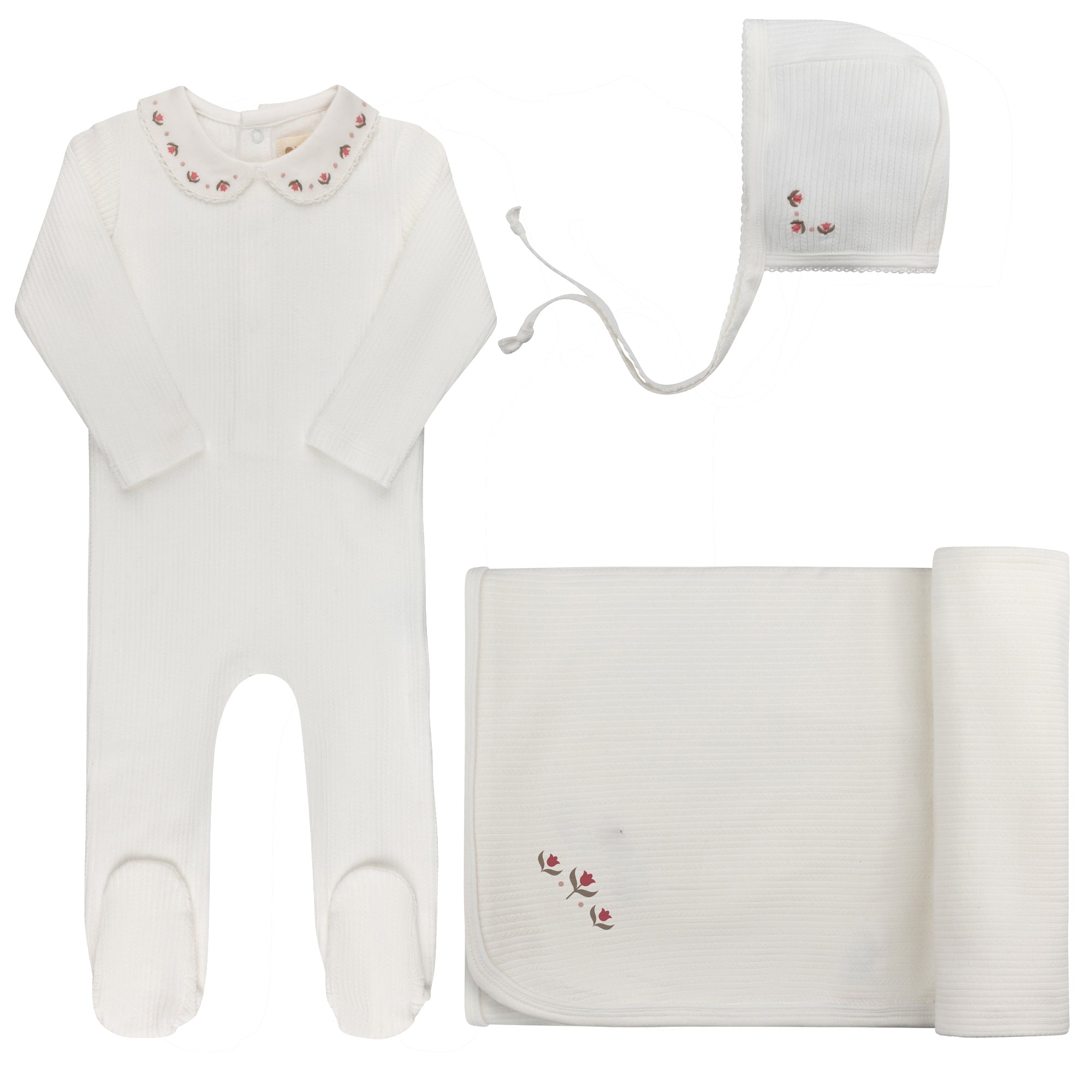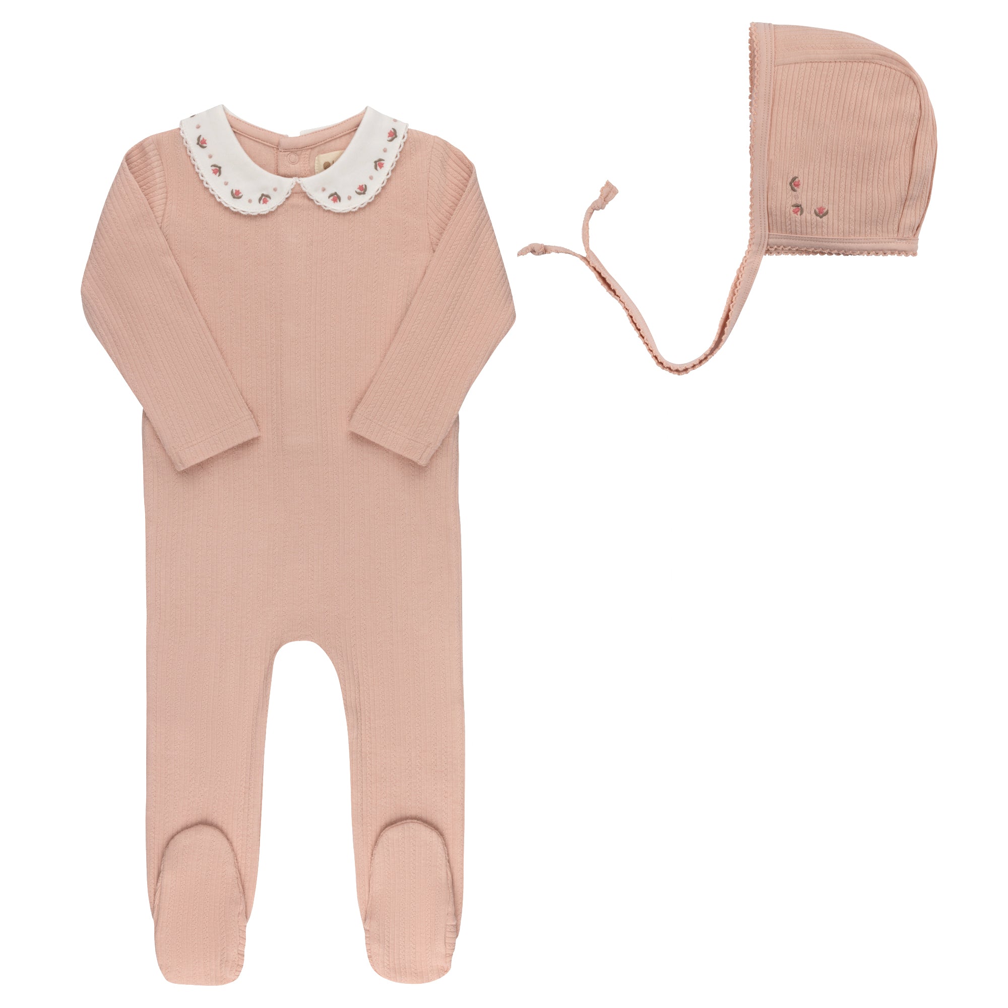 Baby Girl Footie and Bonnet – Ivory/Pink – Keepsake Collection