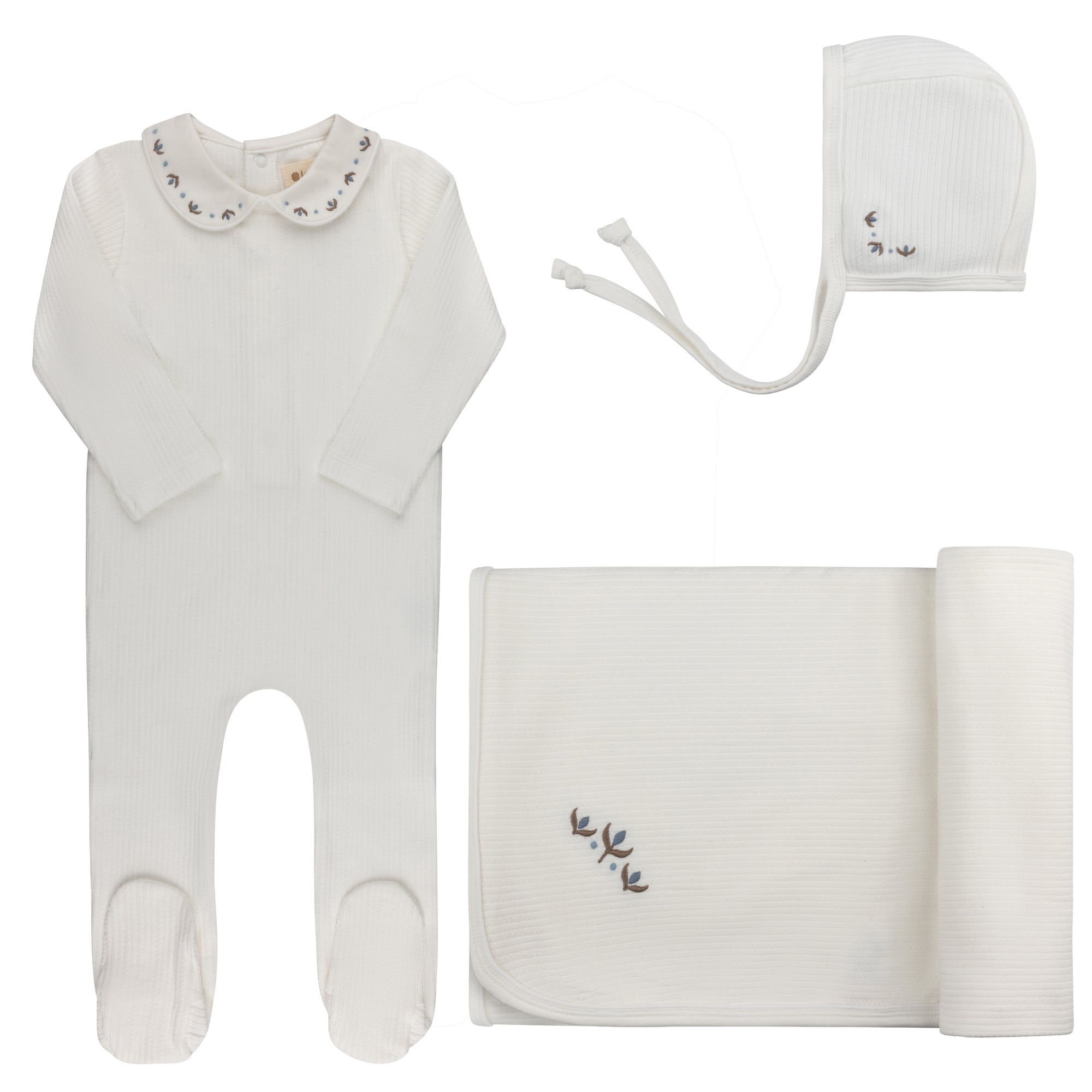 Baby Boy Footie and Bonnet – Ivory/Blue – Keepsake Collection