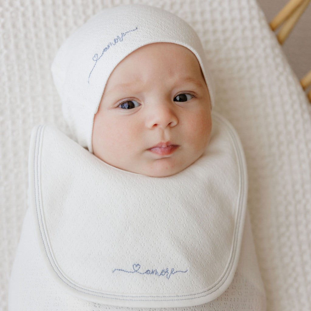 Introduce your little one to timeless elegance with our Organic Cotton Amore Pointelle Collection. This thoughtfully curated set pairs a delicate pointelle footie with a matching beanie, both crafted from premium organic cotton that's gentle against sensitive newborn skin. The intricate embroidered details add a touch of sophistication, making this collection perfect for everyday wear or special occasions. Available in sizes from 1 month through 12 months, you'll find the ideal fit for your growing baby. The breathable fabric ensures comfort in any season, while the soft pointelle knit provides a luxurious feel parents love. Give your baby the gift of comfort and style with this versatile, eco-conscious essential.