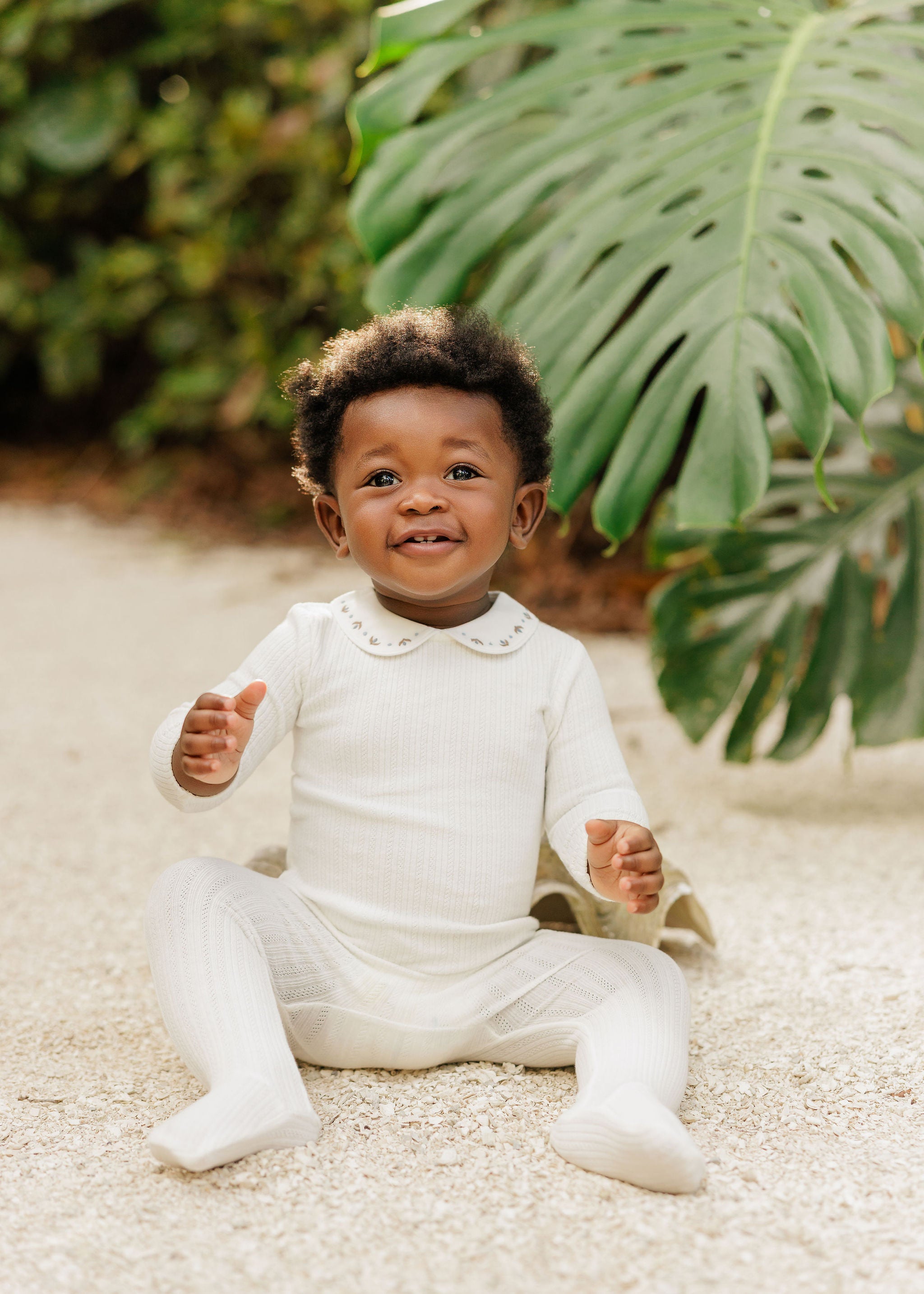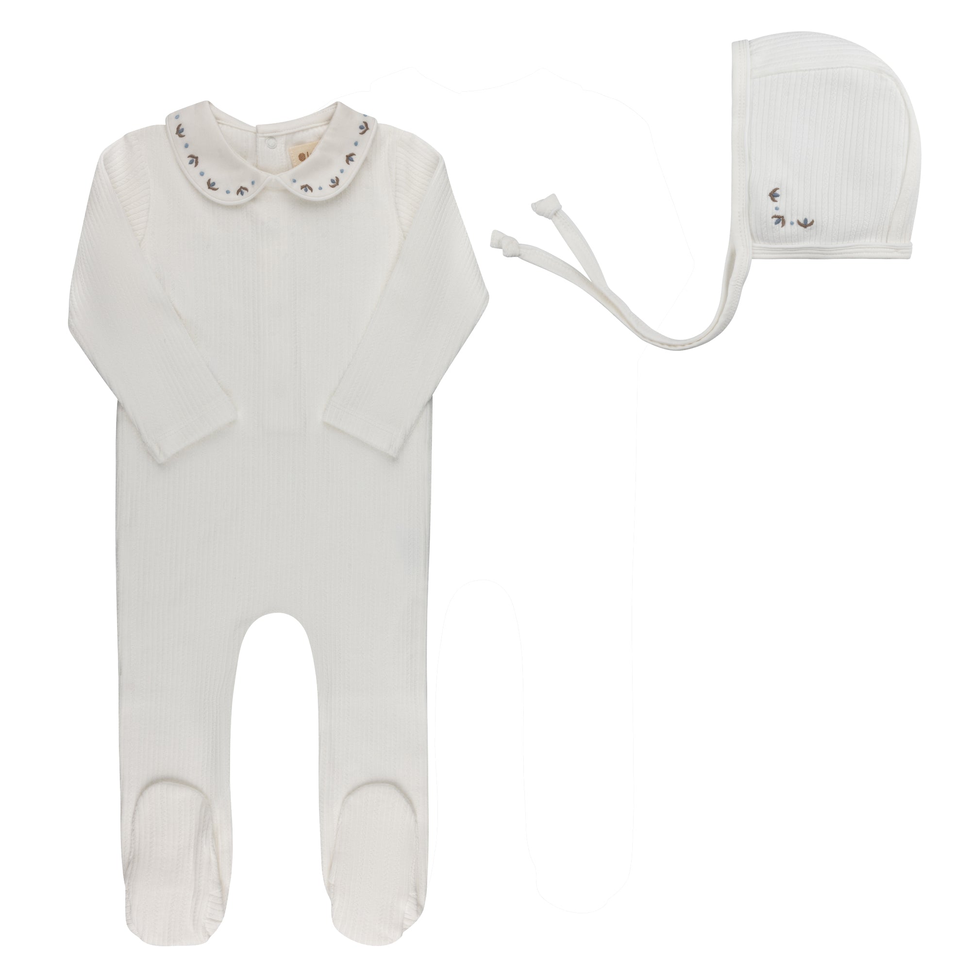 This baby piece is crafted in a soft, gently stretchy knit, featuring delicate heirloom-inspired detailing and a fresh white embroidered collar for a timeless, classic look. The footie (Stretchy) comes with a coordinating bonnet for a complete baby outfit made for the sweetest beginnings.