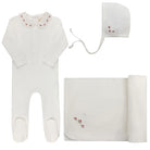 This baby layette set — the perfect take me home set — includes a coordinating footie (Stretchy), bonnet, and blanket, all crafted in a soft, gently stretchy knit with delicate heirloom-inspired detailing. Featuring a fresh white embroidered collar and timeless silhouette, it creates a complete baby outfit made for the sweetest beginnings.