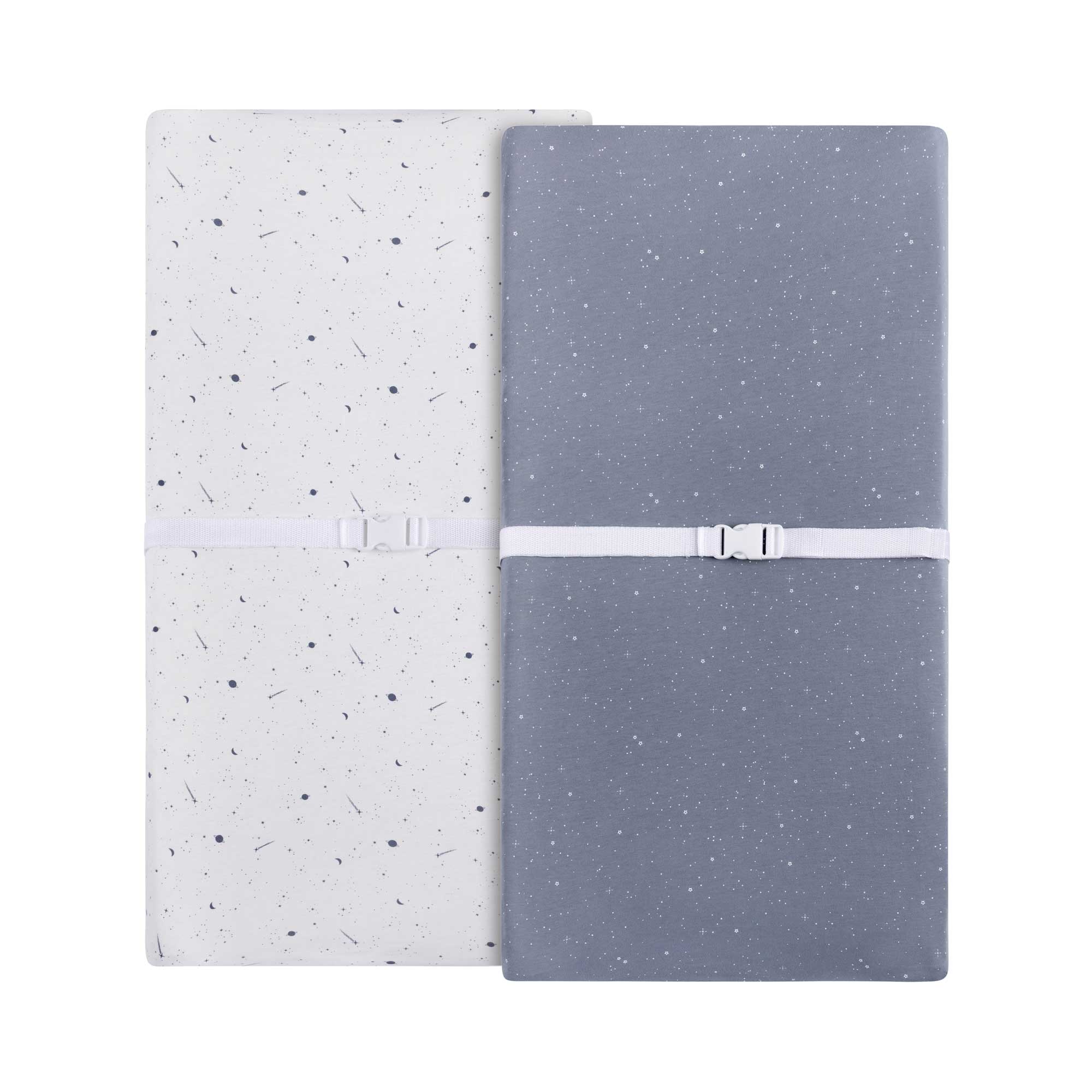- Flexible Fit Changing Pad Cover 2-Pack for Baby Boy in Celestial Print Design – Bundled in our charmingly cute and compact packaging, this set makes for the perfect baby shower gift!