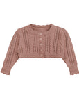 Keep your baby cozy and stylish in this adorable mauve pink, cropped cardigan. Designed to provide warmth and a perfect fit, it pairs beautifully with overalls for a coordinated look. Soft and comfortable, this cardigan will make your little one look irresistibly cute while staying snug.